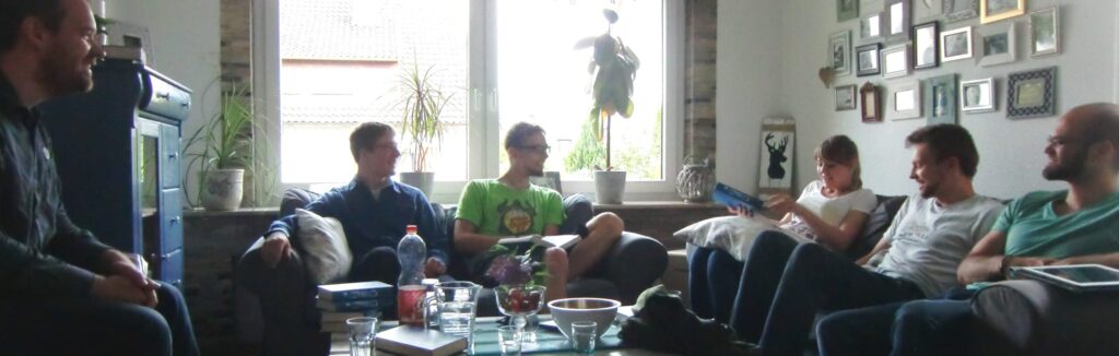 In den Hauskreisen treffen wir donnerstags als Kleingruppen in unseren Wohnzimmern. Dann lesen wir gemeinsam die Bibel, sprechen über deren Bedeutung für den Alltag, tauschen uns über unser Leben aus und beten füreinander.